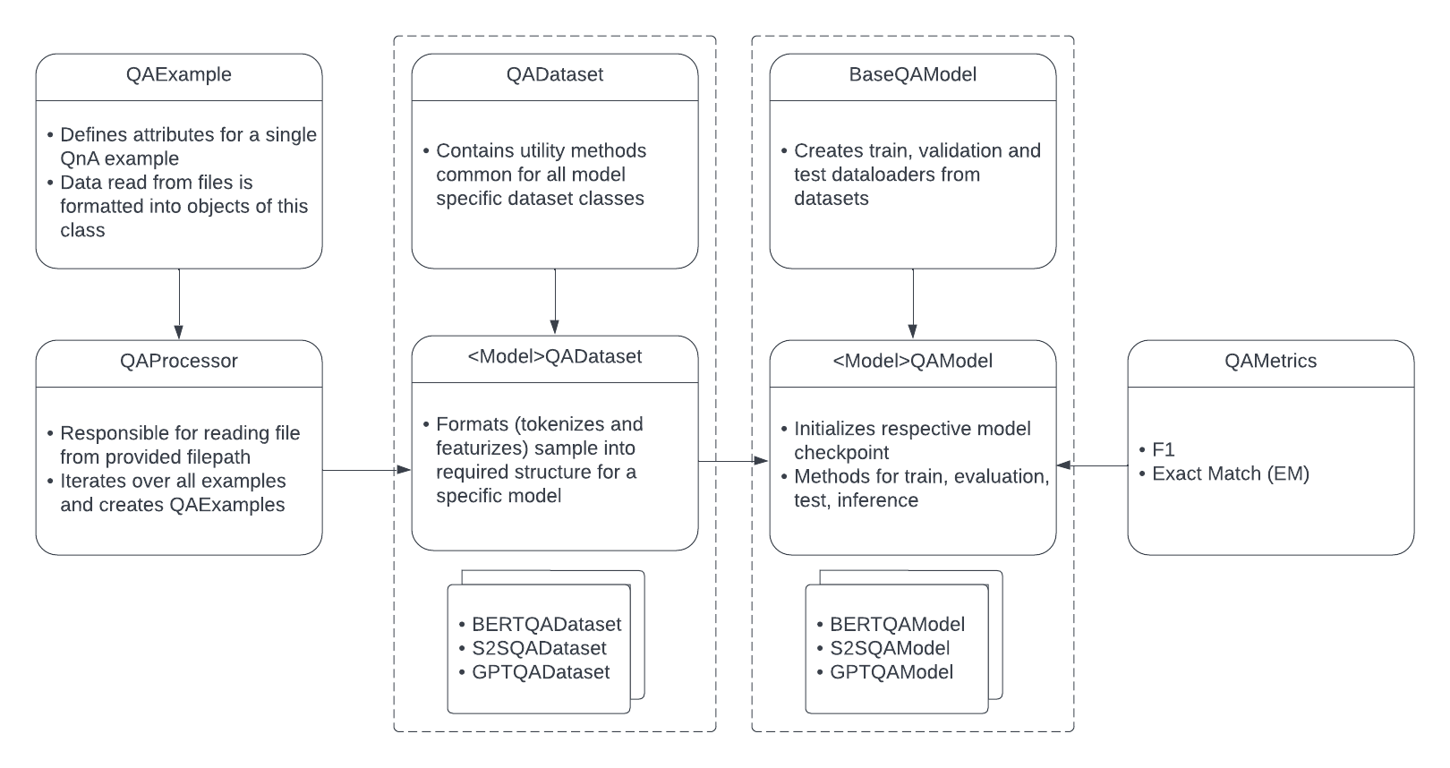 The module is decouple data and model components to support idependent integration of various model achitectures and datasets. QAProcessor, QAExample, and the base QADataset modules are responsible for model-independent data handling utilites like loading SQuAD format dataset files and parsing examples. <Model>QADataset modules handle model-specific data formatting. Similarly, the BaseQAModel module handles common model tasks like creating dataloader, and the <Model>QAModel modules handle model architecture-specific functions like trainig, testing, and evaluation.